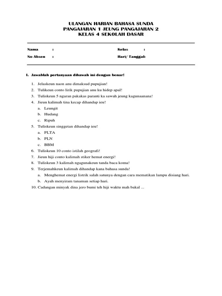Contoh soal ulangan harian bahasa sunda kelas 4 s. Bu guru buminya caket ti sakola. Soal jawab singkat arsip soal ulangan kenaikan kelas sd mi kelas iv semester . Simak latihan soal dan kunci jawaban pts uts mata pelajaran bahasa sunda kelas 4 sd mi semester 1 kurikulum 2013. Download dan dapatkan soal latihan uas b.